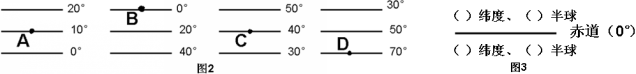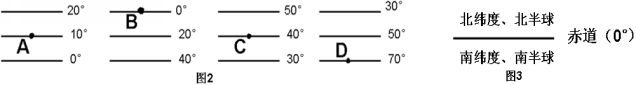 练习2:图2中,A、B、C、D四点,属于南纬(S)的是 ,属于北纬(N)的是 。位于低纬度的是